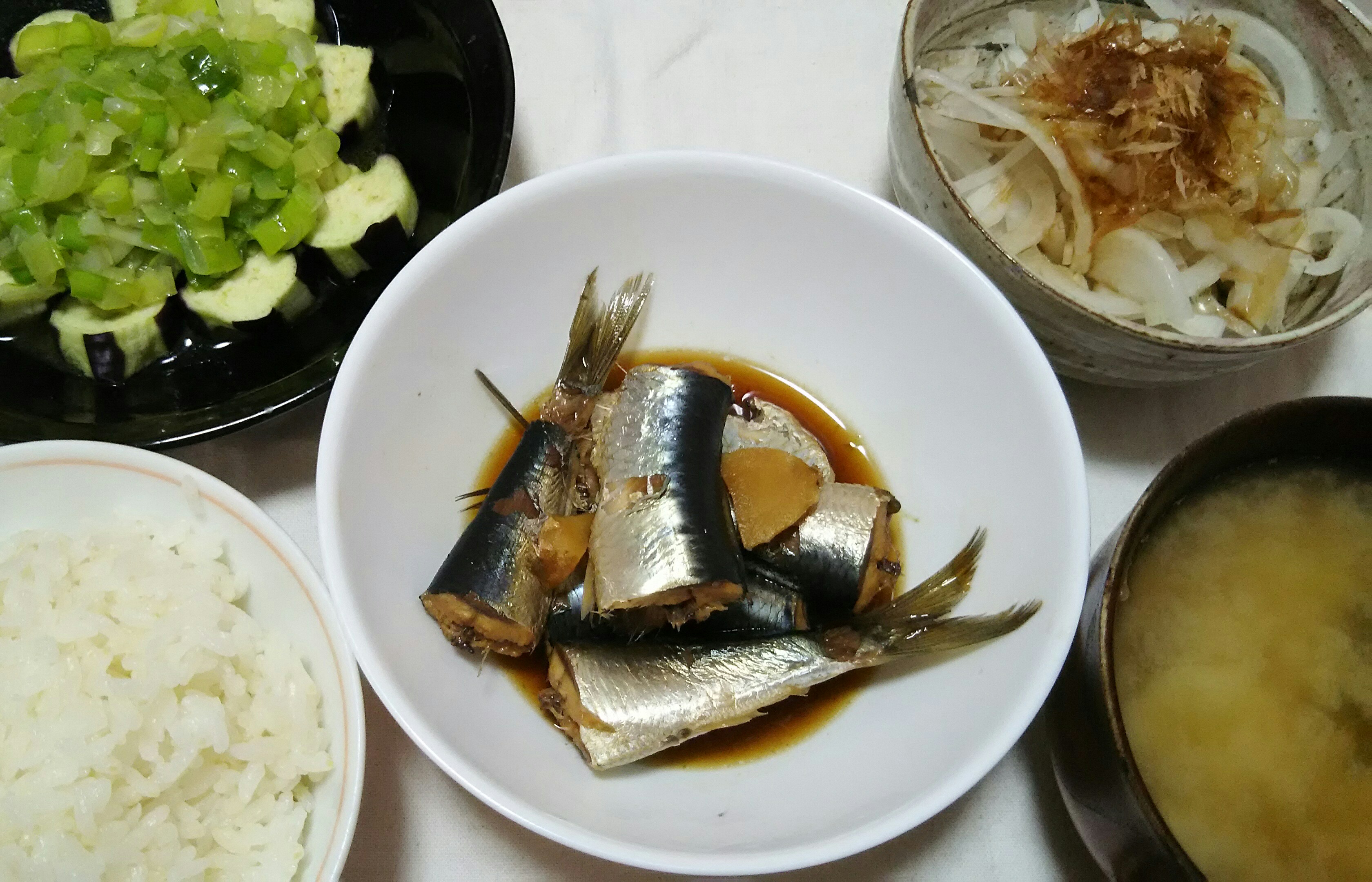鰯の生姜煮、蒸し茄子のネギソースがけ、しんたまねぎのおかかポン酢がけ、味噌汁。