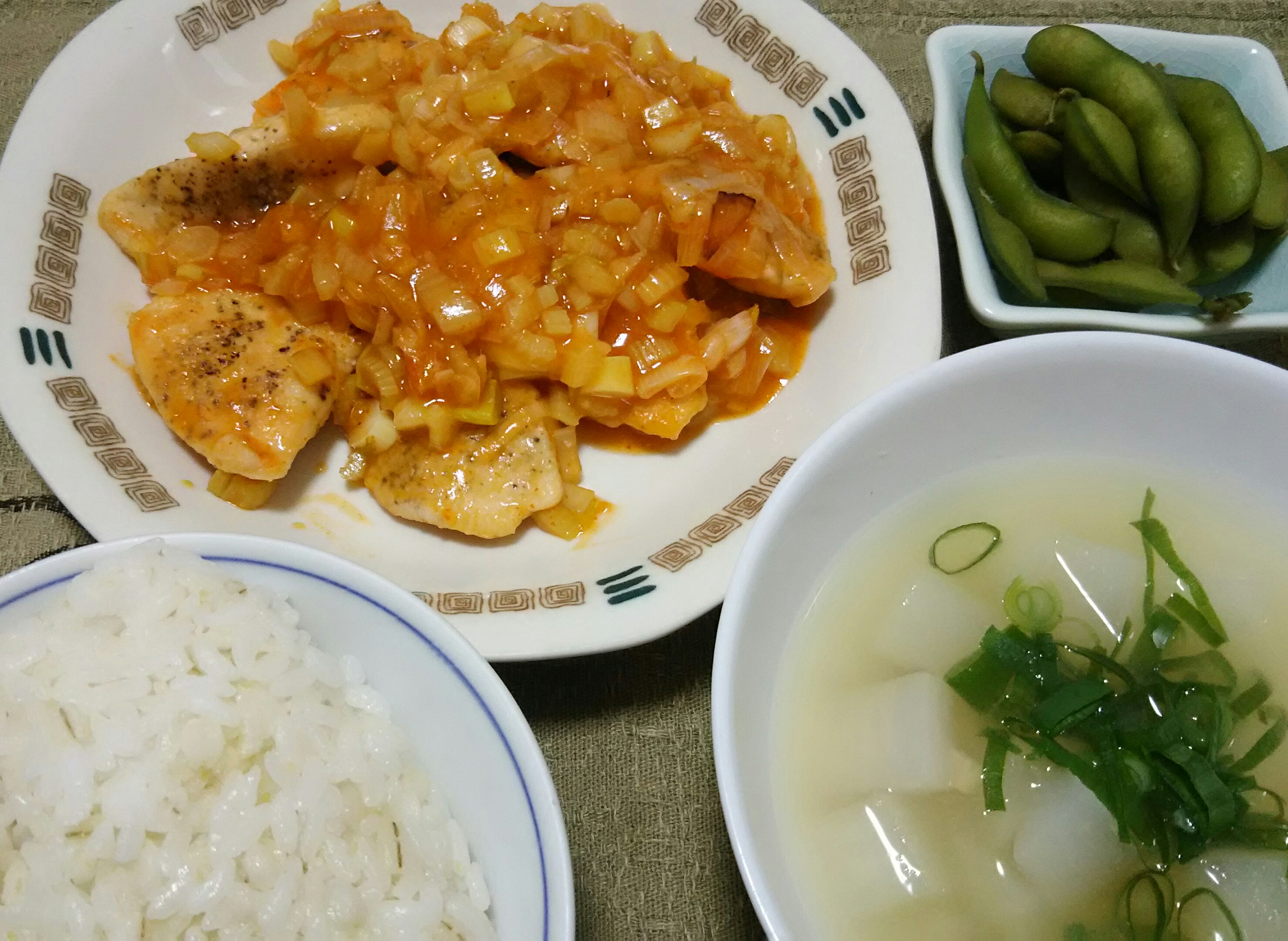 鶏むね肉のチリソース炒め、茹で枝豆、大根のスープ。