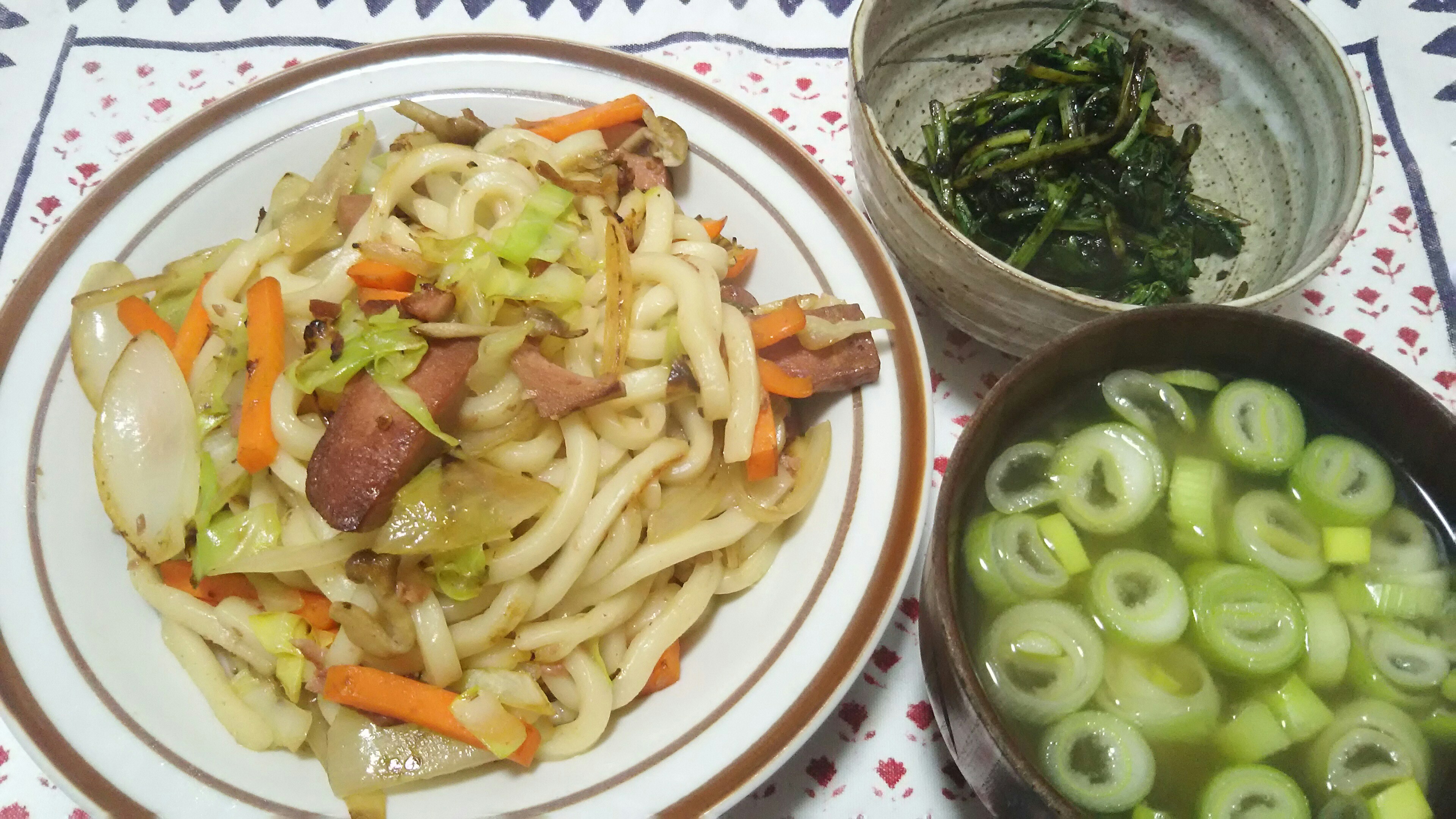 夕飯は冷凍してたうどんを使っての焼うどん。具にスパムを使ってみたので、パンチを出す為に炒め油にラー油を少し混ぜてみたら、丁度いい具合になったかな。