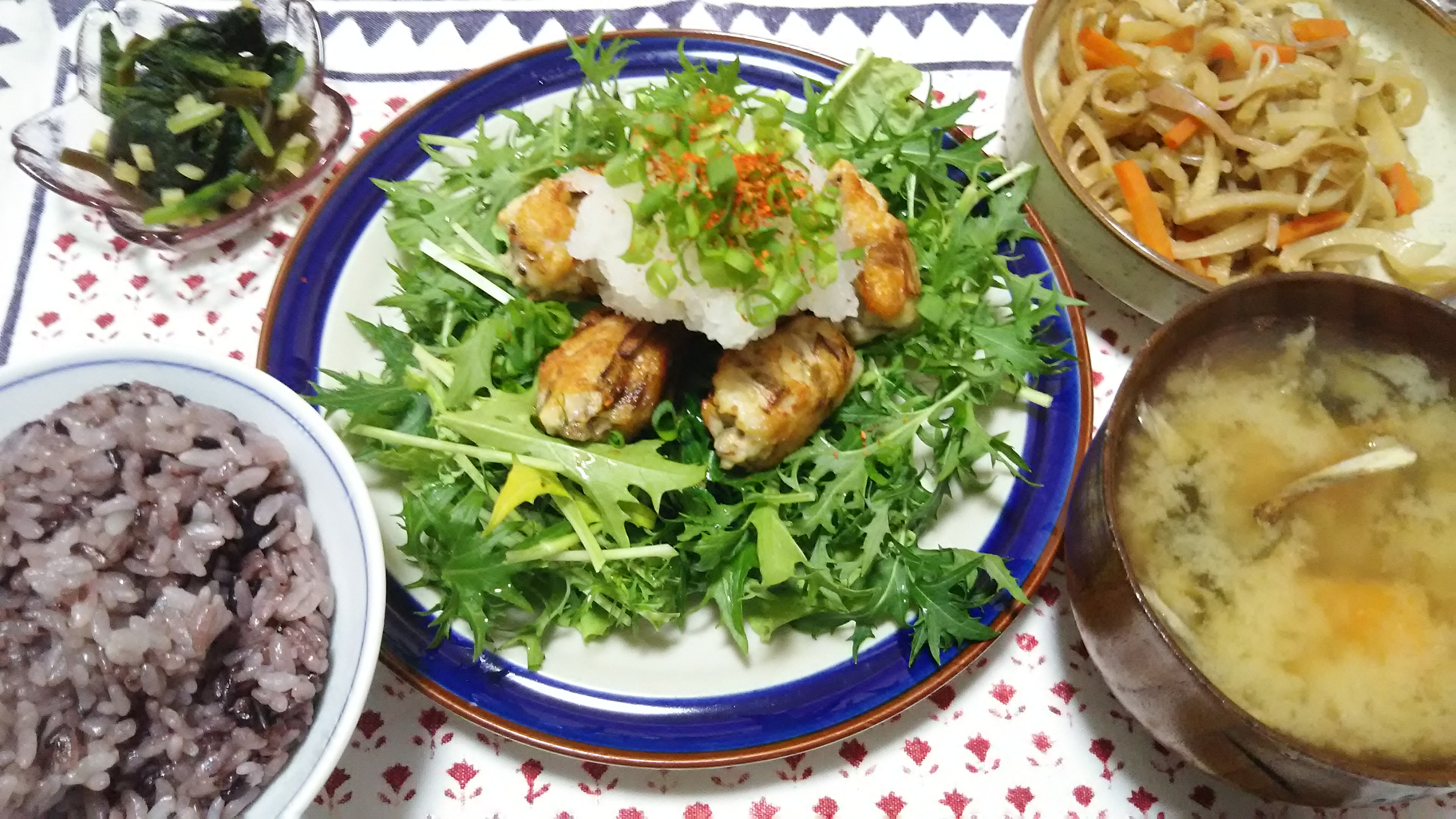 夕飯は作りおきを兼ねて、鶏ゴボウ団子。大根おろしをかけるなら作りたての時にするのが一番美味しく頂けるので、この食べ方で。他に副菜二品と、味噌汁(カボチャ他)、ご飯は黒豆ご飯で。