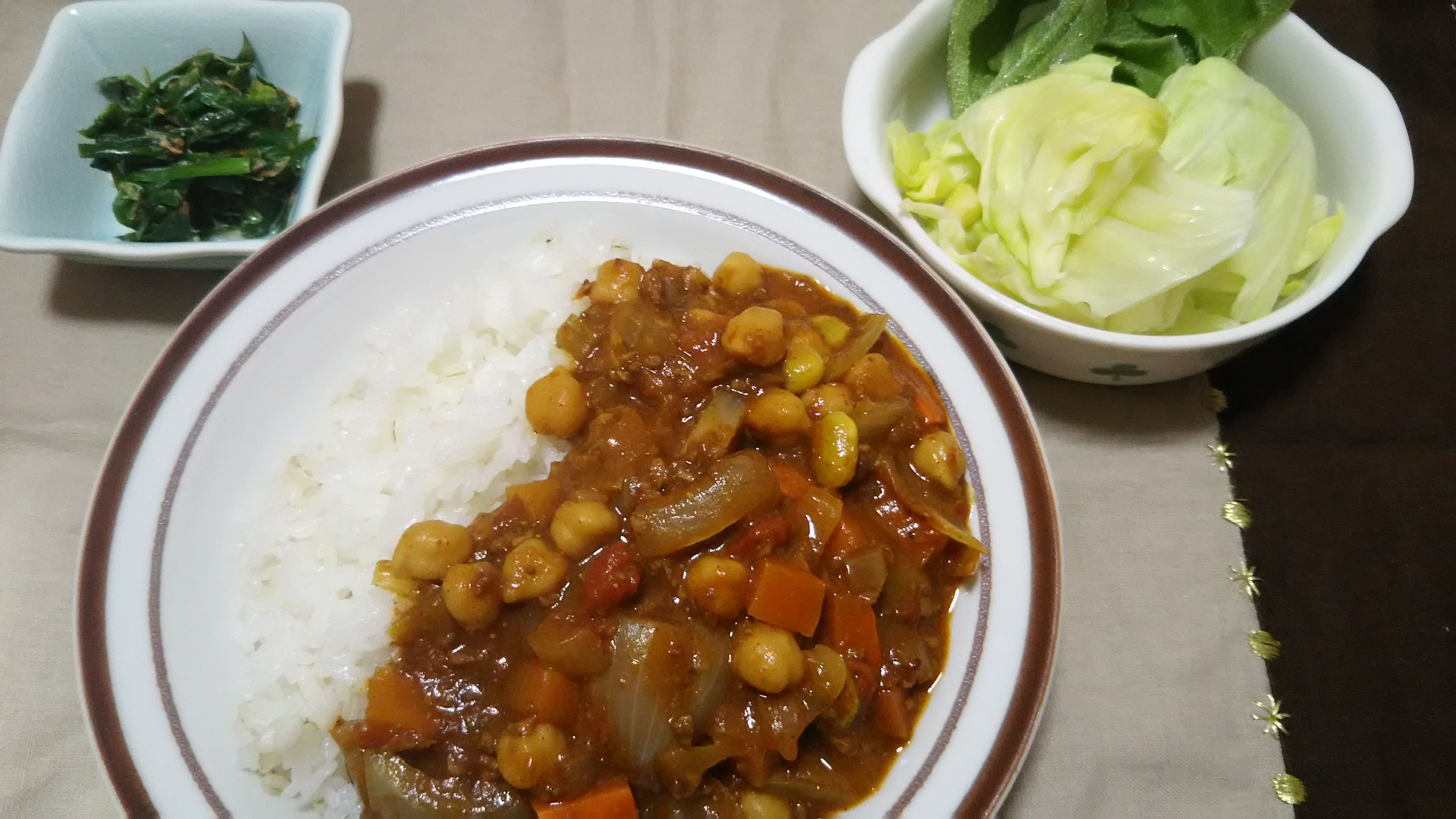夕飯は冷凍ストックのカレーに、ボイルキャベツとアイスプラントのサラダ、ニラのマヨぽんおかか和えで。