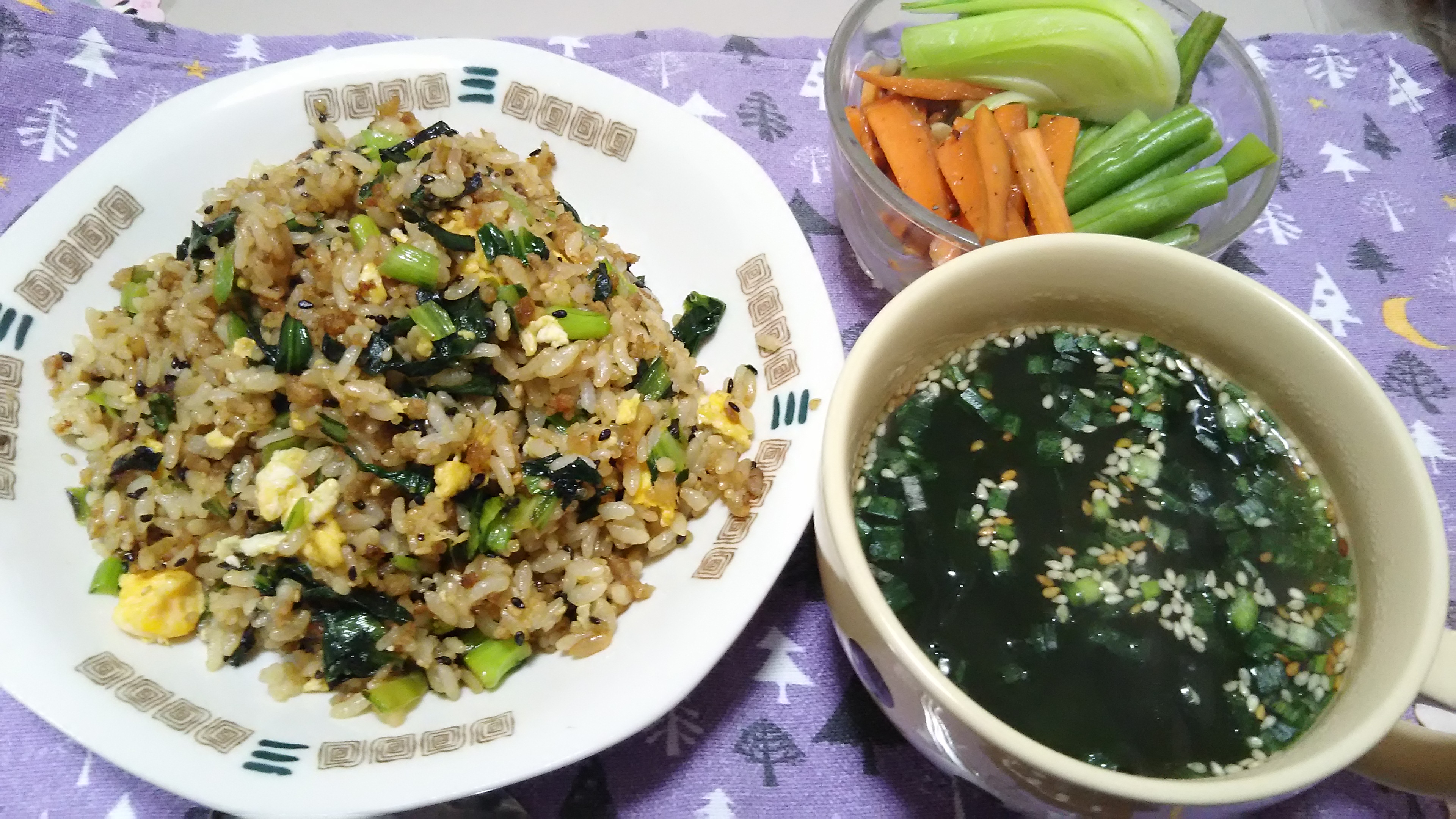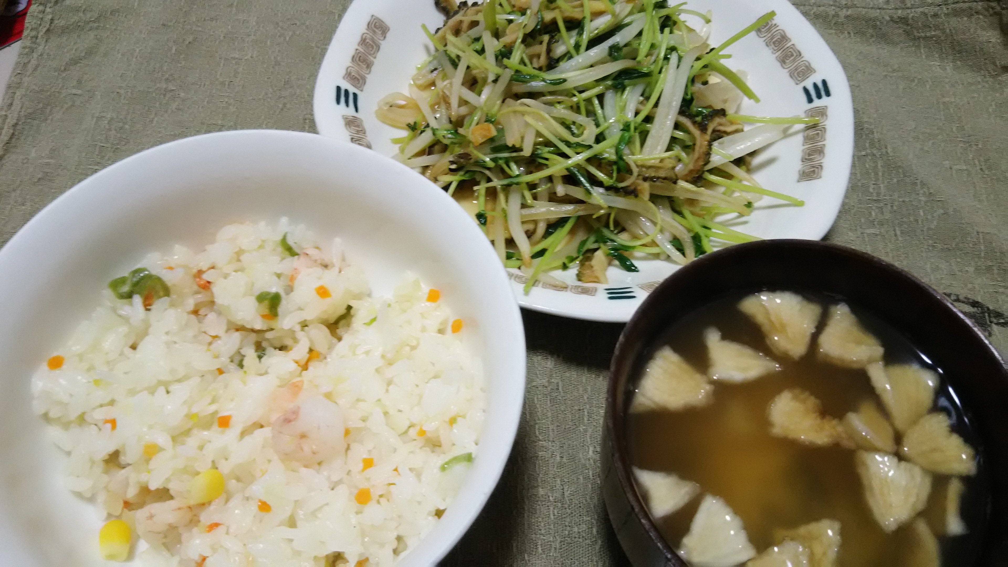 この日は戻った時間が遅めだったので、冷凍のえびピラフ以外は簡単に作れるにんにく炒めと、干し大根の味噌汁にしました。
