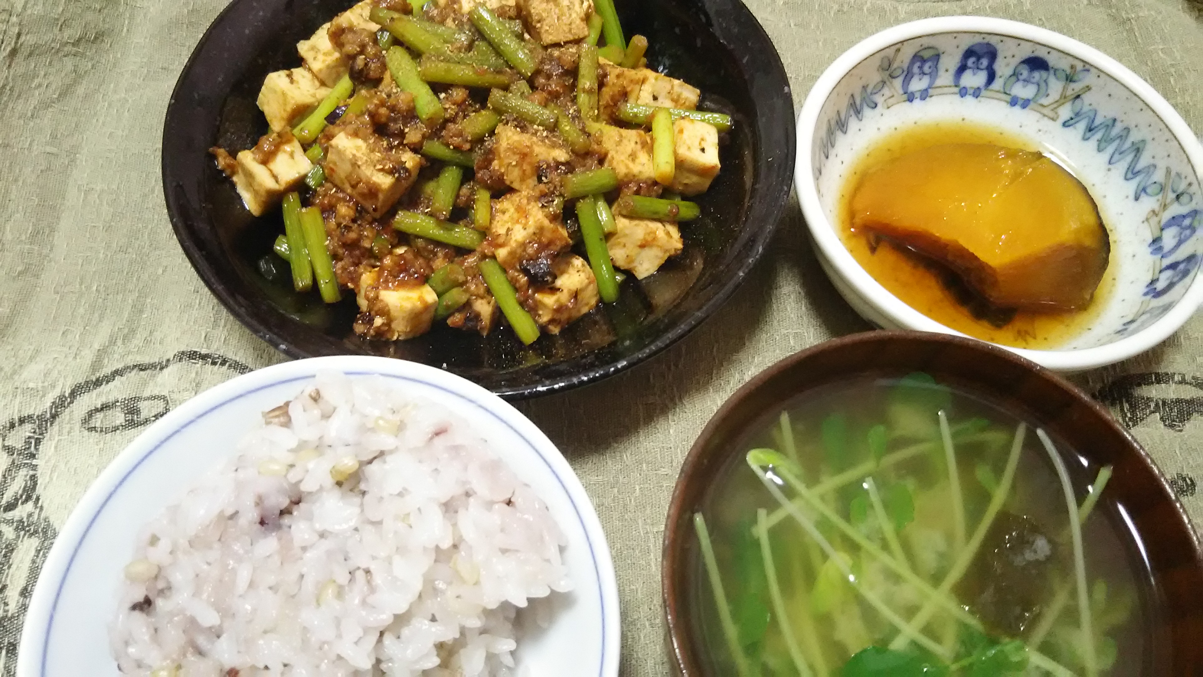 この日は冷凍のニンニクの茎を使って麻婆豆腐。うちのは基本辛いです。