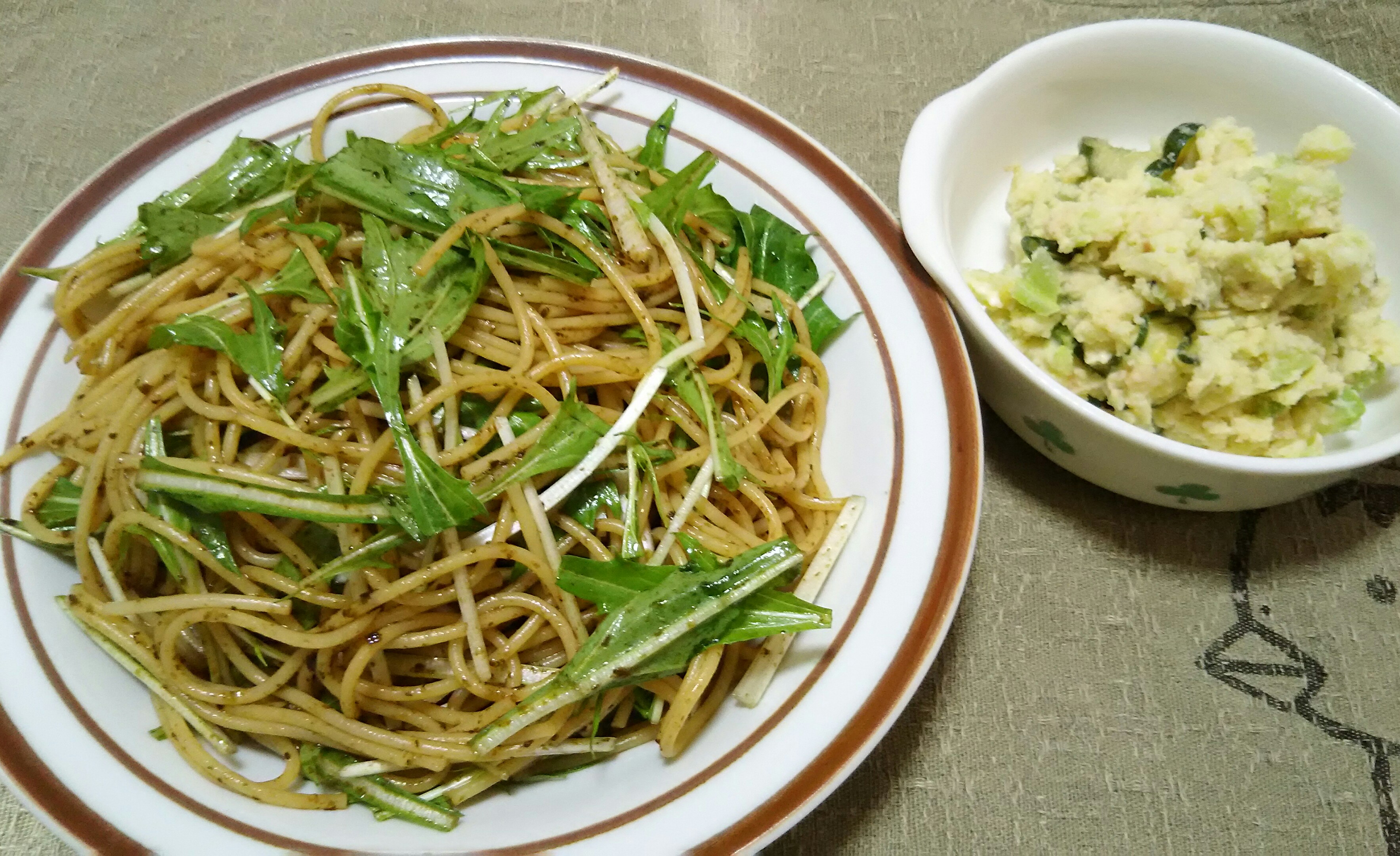 昨日の夕飯(3/17)海苔の水菜の冷製パスタ他