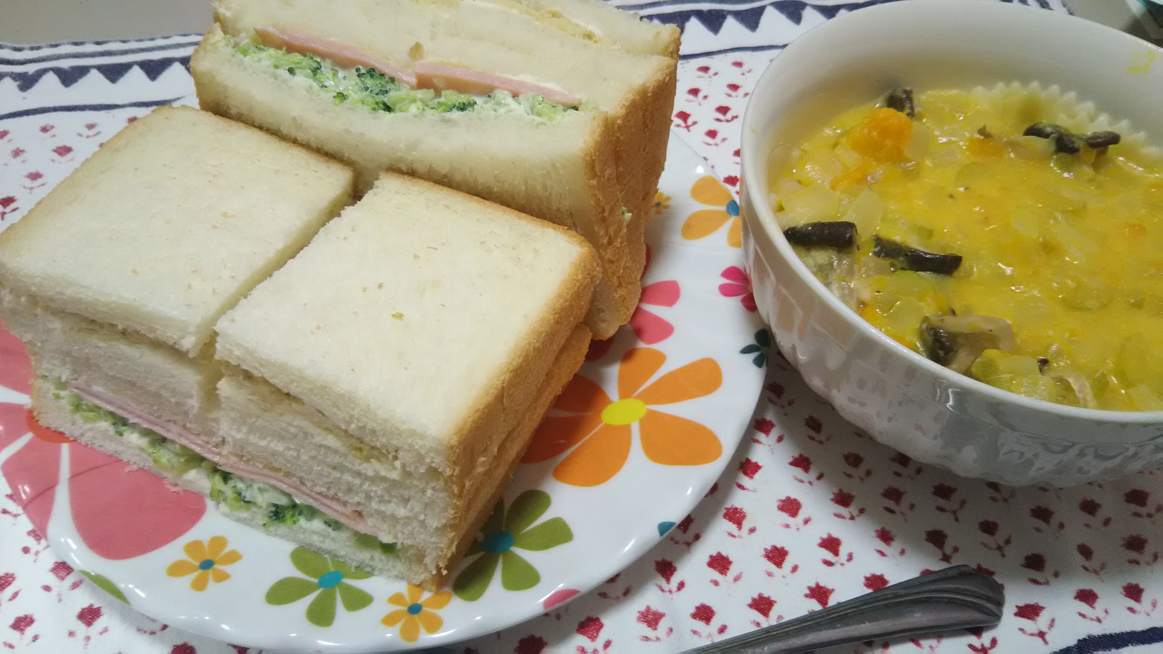 この日はご飯がなく、逆に食パンを余らせていたのて、自動的にサンドウィッチに。挟んだのはハム+ブロッコリーの他、中東の豆ペーストであるフムスを初めて作ってみたので、それでも作ってみました。結構食の進むあじかも。