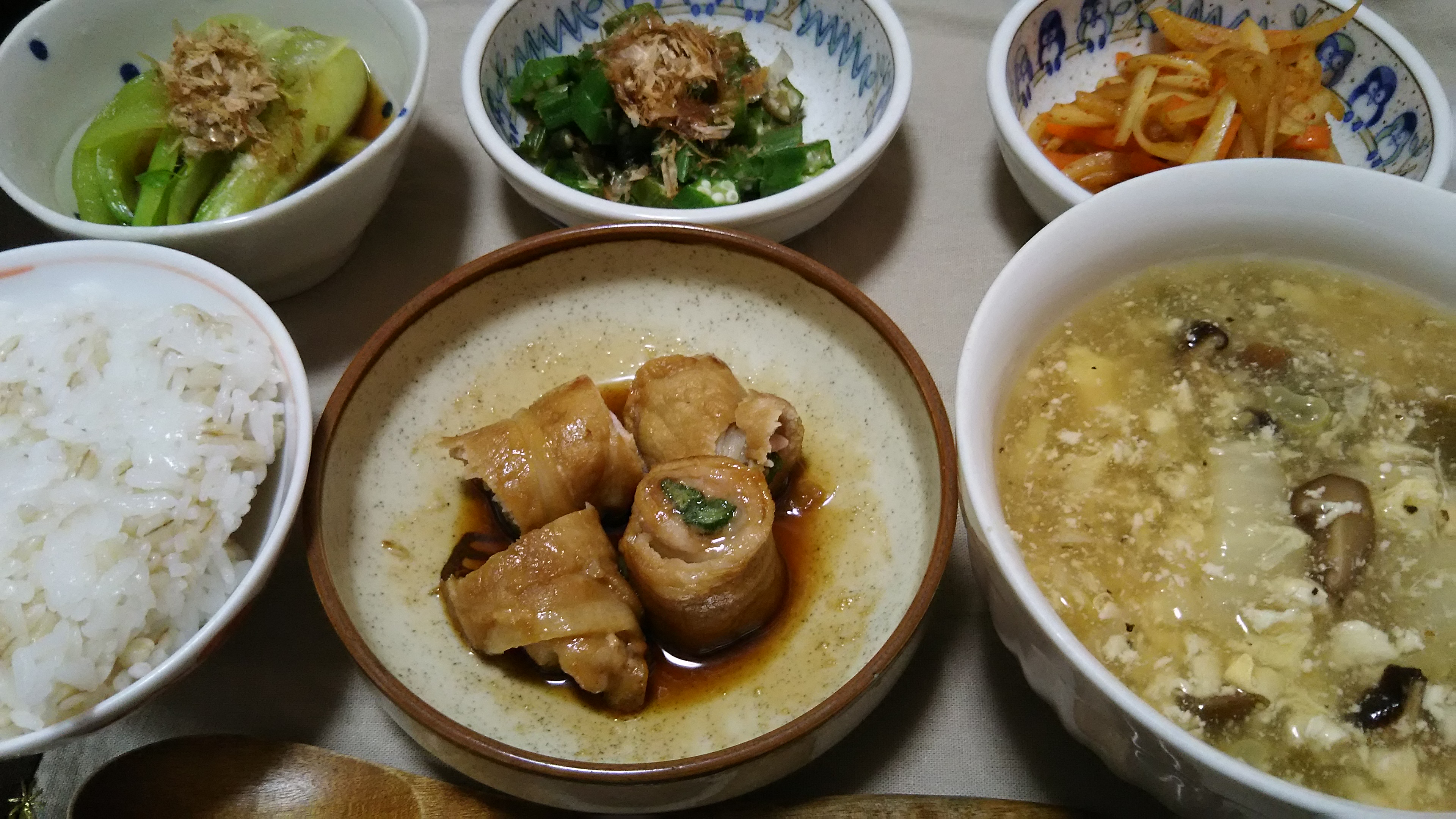オクラの肉巻き(冷凍ストック)、青梗菜のおひたし、オクラのおかかがけ、大根の皮のキンピラ、豆腐のトロトロスープで。