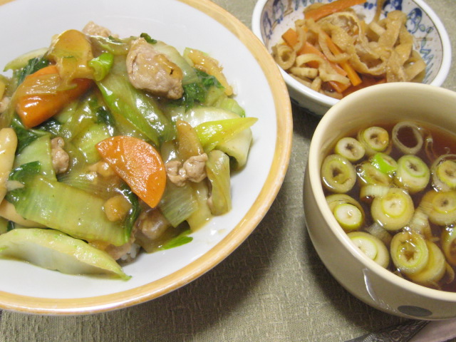 豚肉が残っていたので、それを使い切って、なおかつ野菜がたっぷりとれるメニュー…ということでこうなりましたが、中華丼は物凄く久し振りに作ったと思います(苦笑)