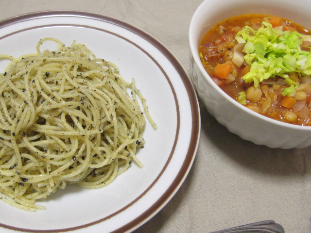 ゴマのパスタは他の品にボリュームがあったりすると、組み合わせるのに便利が良かったりします。今回もう一品が豆と野菜の具だくさんスープで、レンズ豆などに香味野菜がドッサリ入っているので、スープというより温野菜サラダに近いかもw