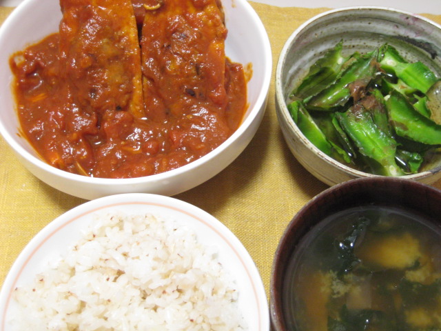 昨日の夕飯(10/6):厚揚げの挽肉詰めトマト煮込み他