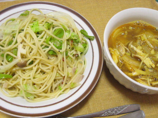 昨日の夕飯。ペペロンチーノのキャベツ入りですが、ピーマンがなかったので、代わりに万願寺唐辛子で(笑)スープは鯖の水煮と玉ねぎのカレースープ。ちょっと気温が上がったのもあってか、これ食べたら結構汗をかきました。
