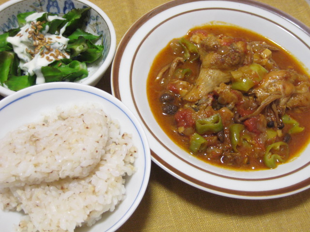 昨日の夕飯(10/10):手羽元の夏野菜煮込み他。