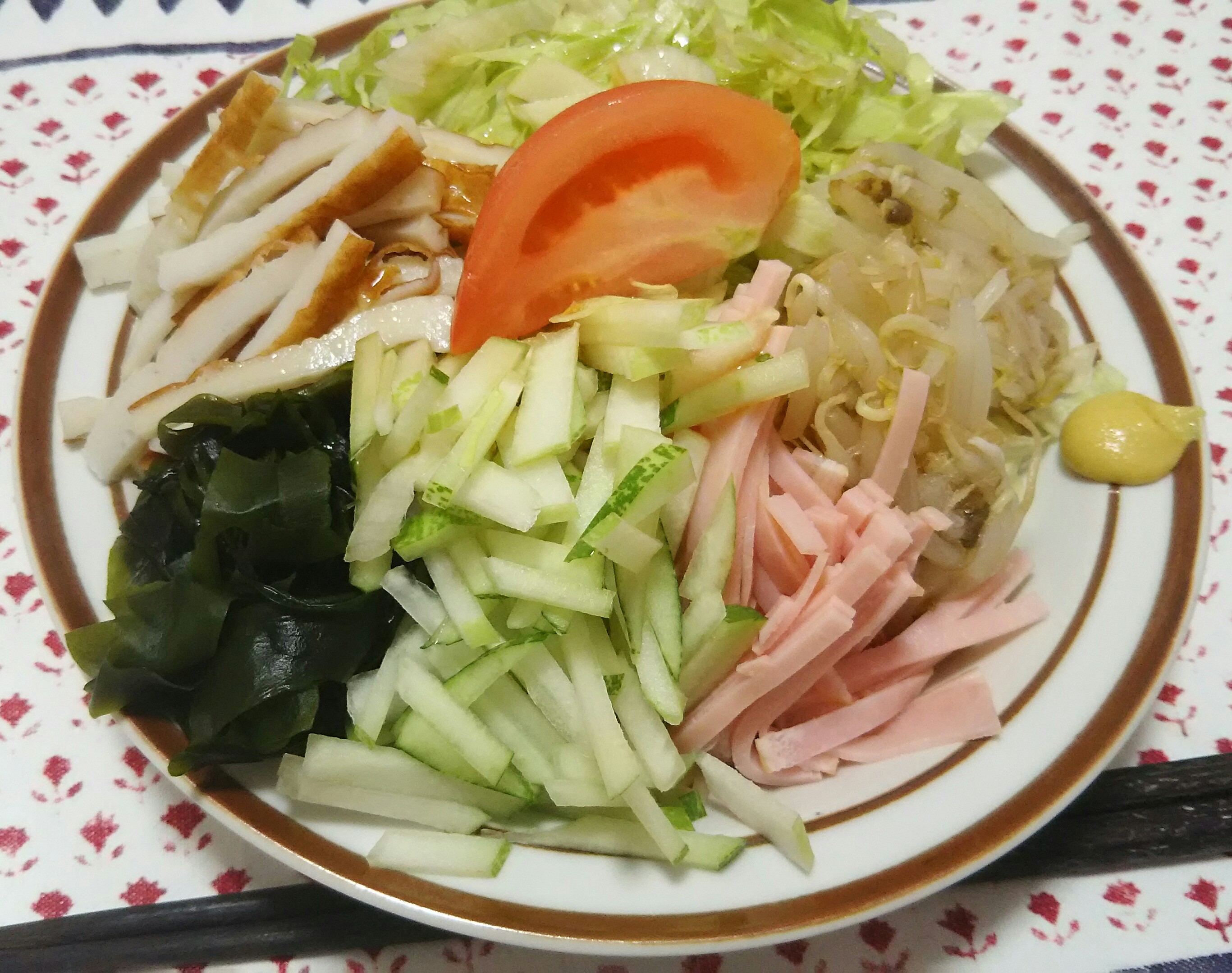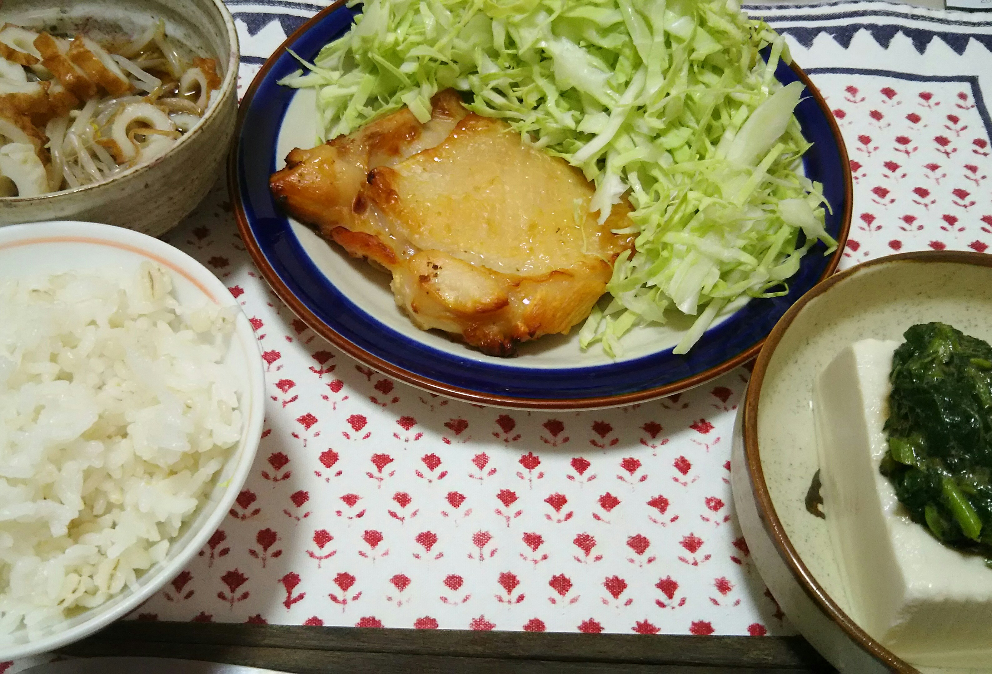 チキンソテー、モロヘイヤの冷ややっこ、モヤシとちくわの酢の物。