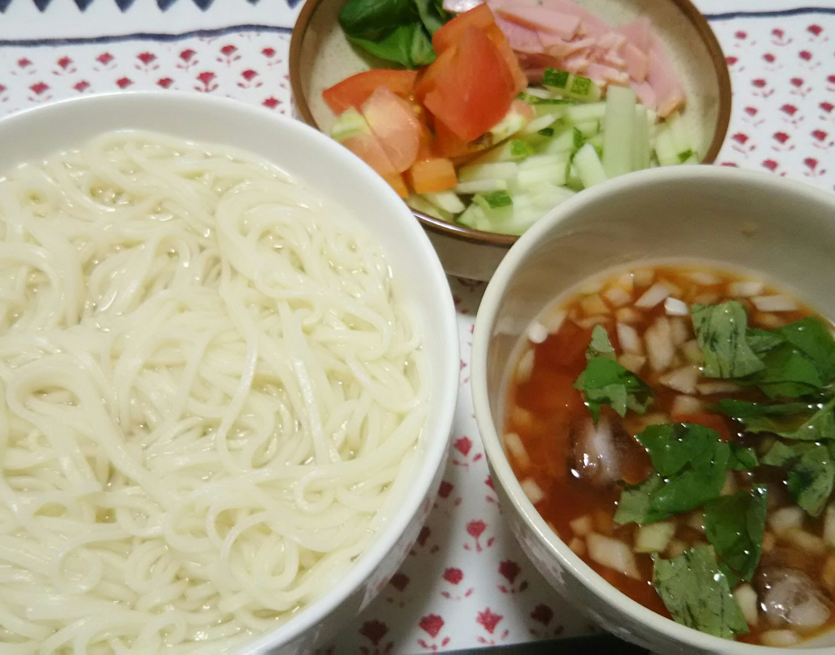 トマトつけ麺。麺がひやむぎなので、つけ汁は和風ベースに(パスタだとオリーブ油を垂らしたり、具にオイル漬けのツナなど使います)。