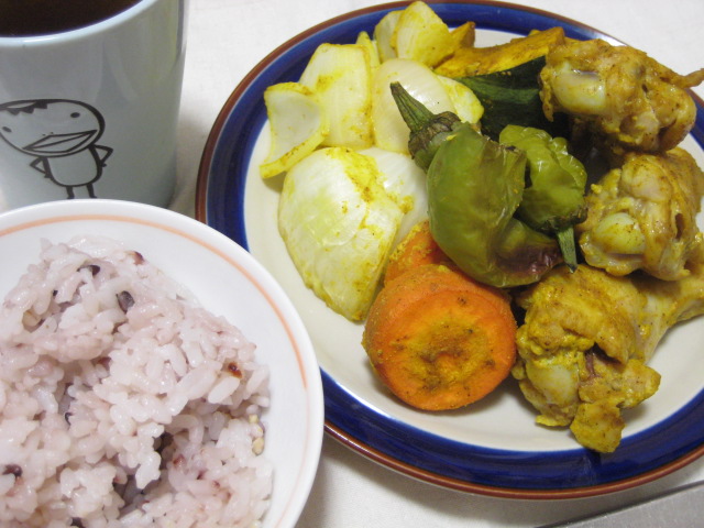 夕飯。前の日に食べそびれた手羽元を、その日のうちに野菜と一緒に漬け込んでおいたので、当日はもうオーブンで焼くだけという手軽さww