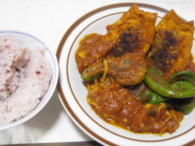普段は挽肉で作る厚揚げの詰め物を、この日は残ってた鯖の水煮で作ってみました。あらかじめちゃんとほぐせば問題ないですね。で、普段ならトマト煮にするんですが、この日は思い立ってカレー仕立てに…これについてはトマト煮の方が、自分的には好みかも(まぁ、初めての試みなので、改善する余地は十分にあるんですがw)。