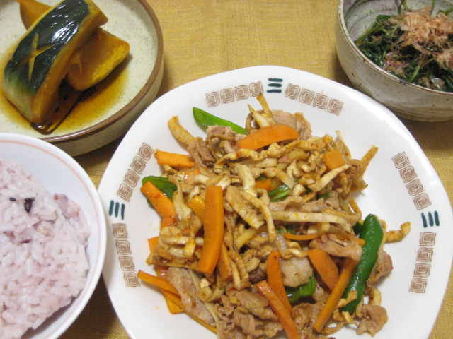 昨日の夕飯。切り干し大根と豚肉のピリ辛炒め、空心菜のおひたし、こぼちゃの煮物。そろそろ切り干し大根の煮物を作っても良さげなシーズンですねぇ…。