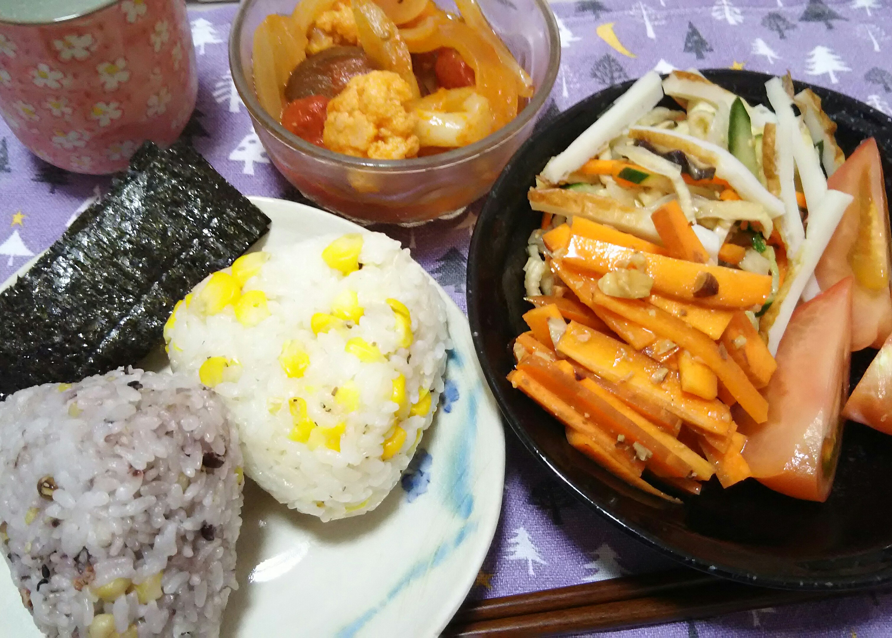 おにぎり二種(トウモロコシおこわ、雑穀米の混ぜご飯)、サラダ二種+生トマト、ラタトゥイユ。