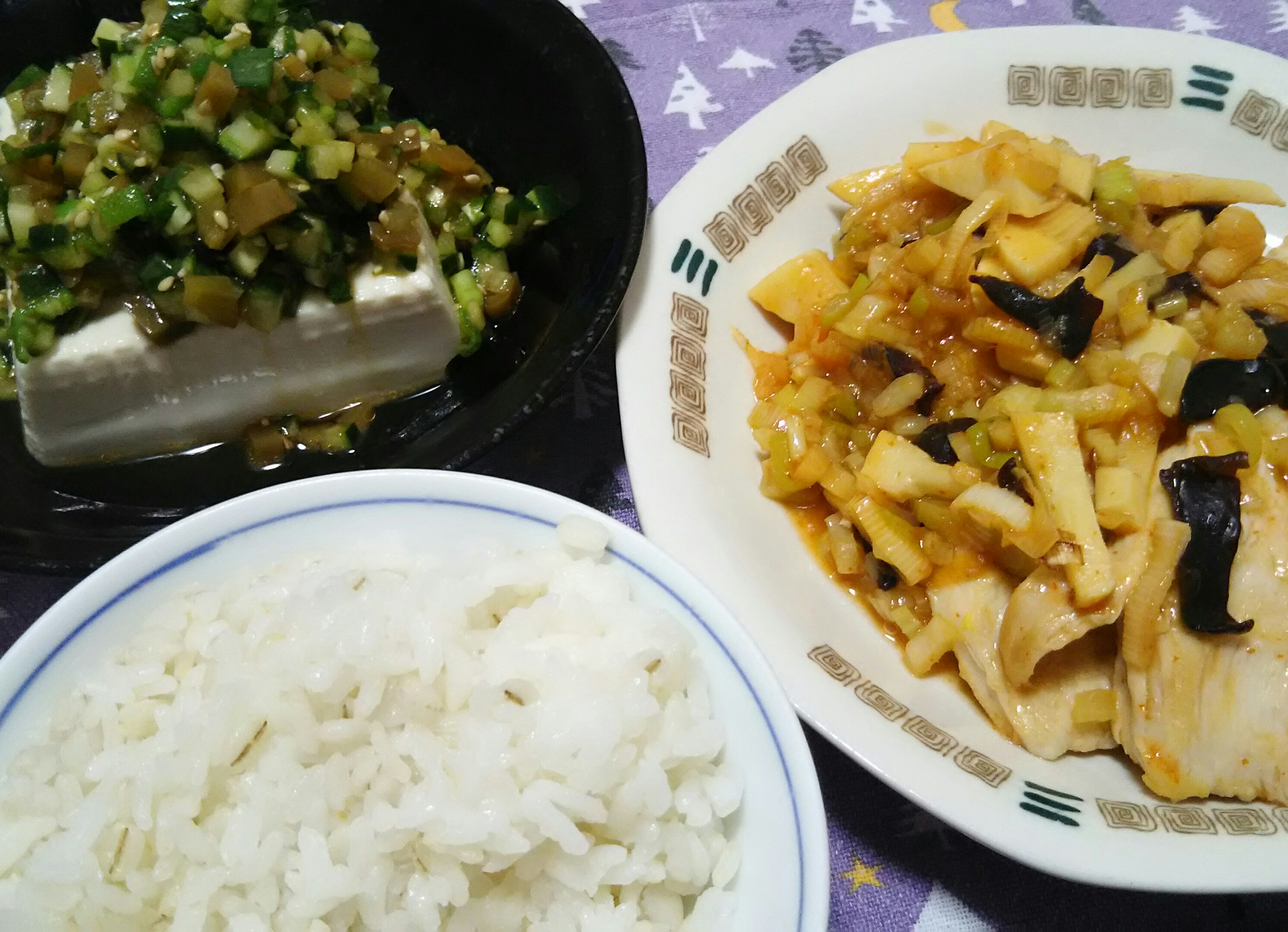 鶏むね肉のチリソース炒め、具沢山冷や奴。