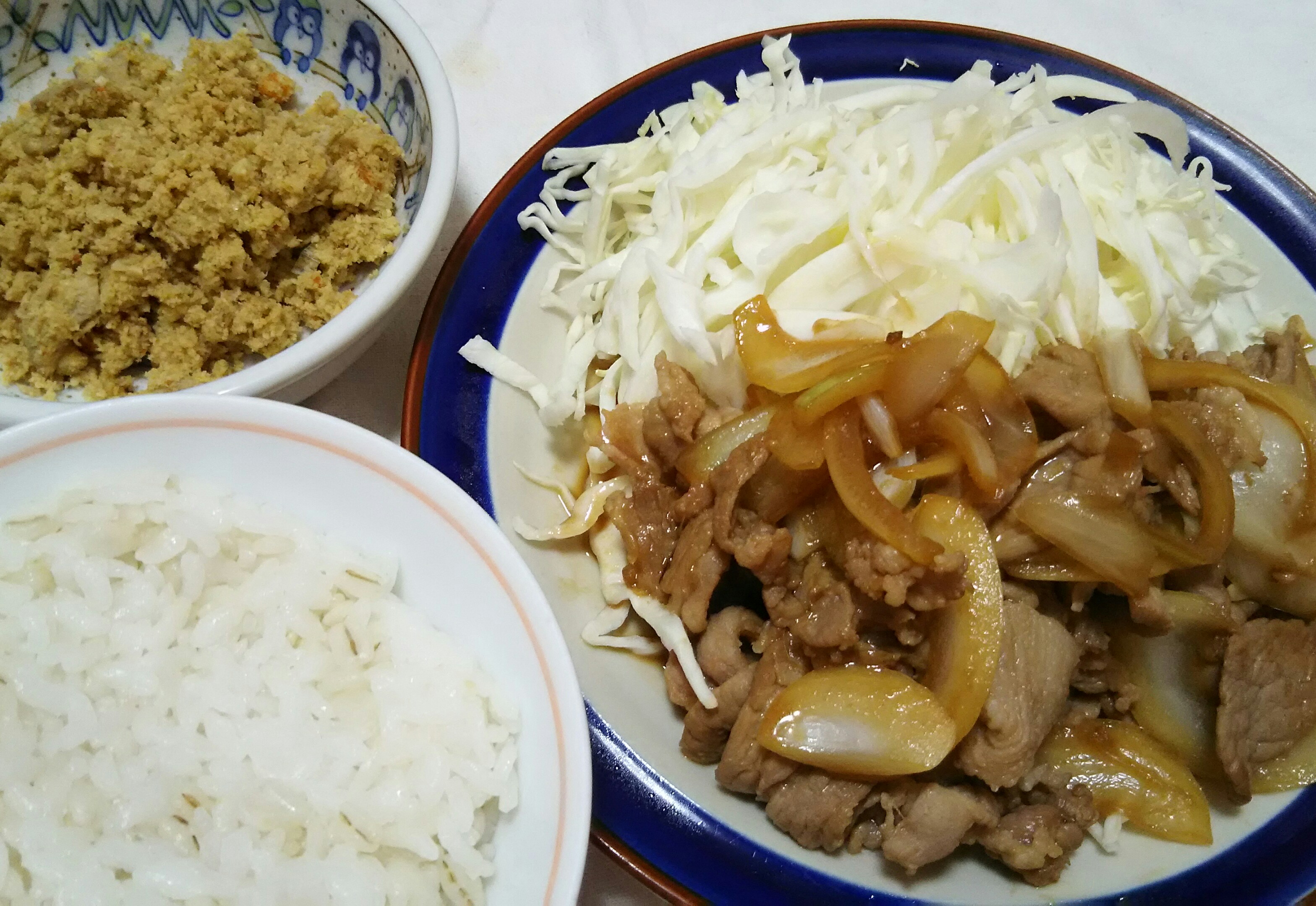 豚肉の生姜焼き、カレーおから。月末最終日なので、残り物だけですが、6月は結構肉も野菜もストックが残ったかも。