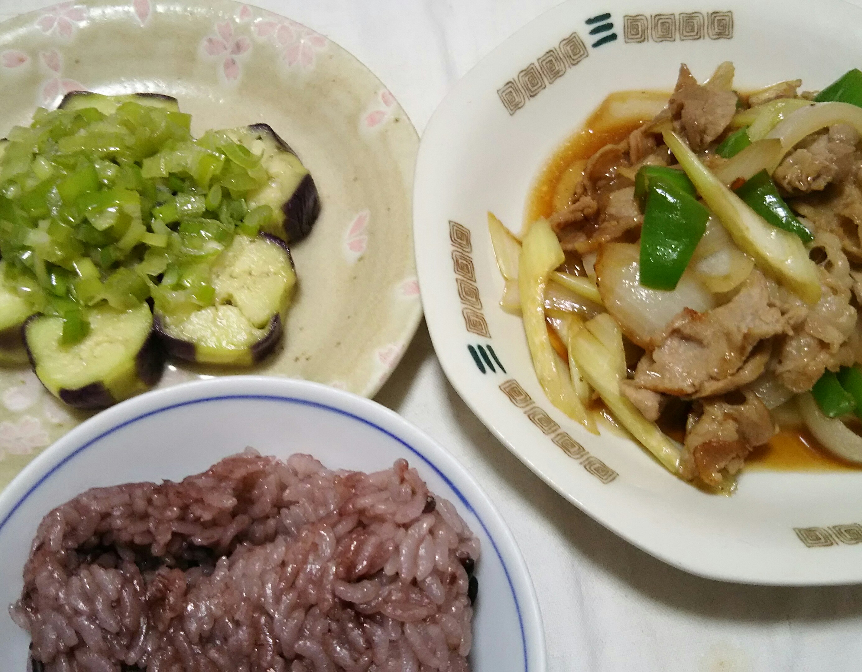 月明けなので、先月からの持ち越し分の消費から。肉野菜炒め、蒸しナスのネギソースがけ。