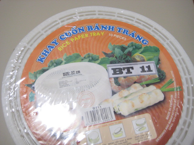 これはそんなライスペーパーを一度に複数枚一気に濡らして、そのまま水切りできるうえに、巻きの作業もプレートの上でそのままできるので、1枚ずつ手早く巻くのが可能になるんです。プレートはプラスチック製で網目がついていて、そこにライスペーパーをセットし、あとは同じようにしたプレートを重ねて、最後に空のプレートをセットしたら、そのまま水の中へ潜らせて、水切りするだけ(私が買ったものにはついてなかったんですが、製品によっては水切りしやすいよう、垂直に立てるスタンドつきのものもあるらしいです)。