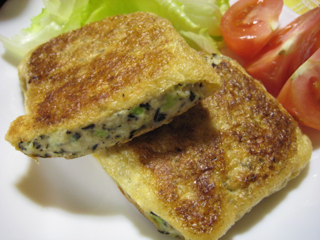 ミンチカツ種を油揚げの中に詰めて焼くんですが、こうすると利点がいくつもあるんです。