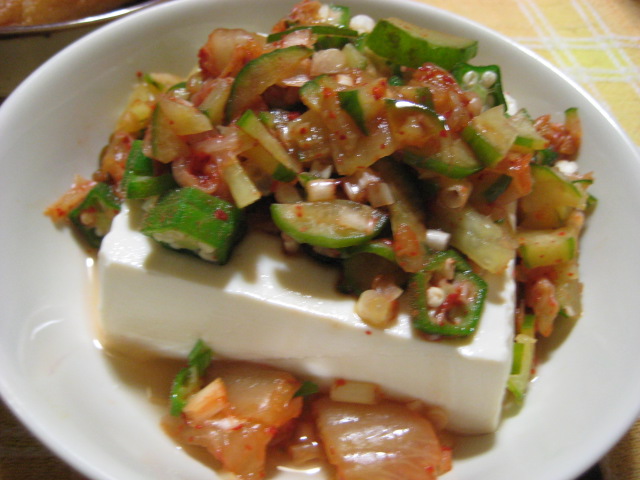豆腐1/2丁に対して、白菜のキムチ少々を粗く刻んだものと茹でて輪切りにしたオクラ1~2本、薄い輪切りにして塩もみしたキュウリを粗微塵切りにしたもの少々を合わせ、豆腐の上にどっさり載せ、最後に醤油を軽く垂らせばできあがり。