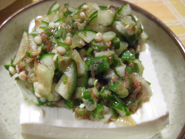 豆腐半丁に対して、オクラ3~4本を軽く茹でて刻み、そこに薄切りにして軽く塩を振って3~5分ほど置いてから水洗いして絞ったキュウリ、種を抜いて潰した梅干1個をまな板の上で包丁で粗く刻むようにして合わせてゆき、全体がよく混ざったら、容器に移してかつお節適量と醤油(味を調える程度)を少々加えて混ぜ、豆腐の上に載せて出来上がり。