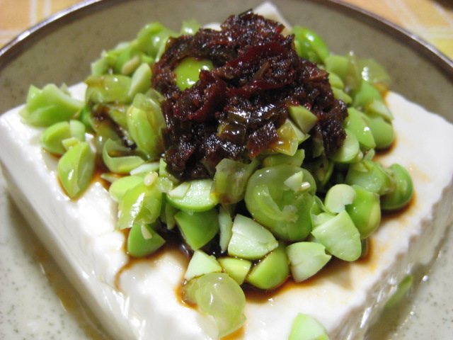 これは茹でた枝豆を好みの量を鞘から出して、包丁で粗く刻んだ後で豆腐に載せ、そこに食べるラー油をティスプーン2杯ほど載せて最後に醤油を少し垂らせば出来上がり。