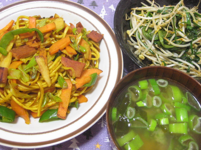 この日の夕飯は焼きそば。当初は塩焼きそばを予定して、そのつもりで具を用意した点ですが、調理中に粉末鶏ガラスープが切れてたことが発覚…急遽、カレー味に変更したという(苦笑)予定外だったので、結構適当な味付けになってしまったかも。あと、焼きそば用の麺が普段のと違うのを使った所為か、若干使いにくかったかな