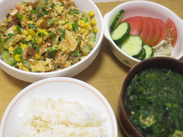 副菜は野菜サラダ、汁はオクラとモロヘイヤ入りの味噌汁で。