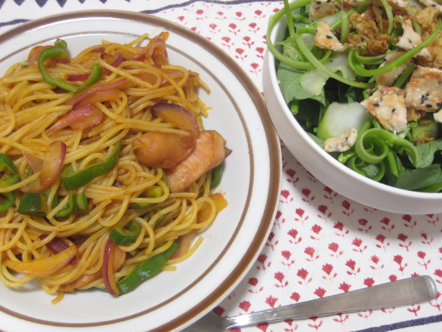 実を言えば、どっちも個人的に今一つだったかも…ナポリタンの方は、それを選んだ理由が前に優待でもらった、某有名メーカーの炒めるだけでナポリタンが作れるという調味料だったんですが、うーん…味が濃すぎる。普段自分で作る時に使うケチャップの量に近いラインでかけてみたら、やたらとしょっぱい…というか、肝心のトマトの味がろくにしない。これはもう肉野菜炒めに使うとか、他の使い道を考えた方がいいかもですね。自分が食べたいナポリタンの味とは違うわ(苦笑)
