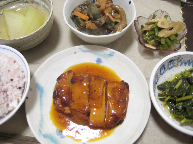 副菜は冬瓜の煮物。本来はもう一品用意する予定でしたが、ウナギのちらし寿司が買えたので、それを代わりにつけました。折角の土用の丑の日ですもんね(苦笑)