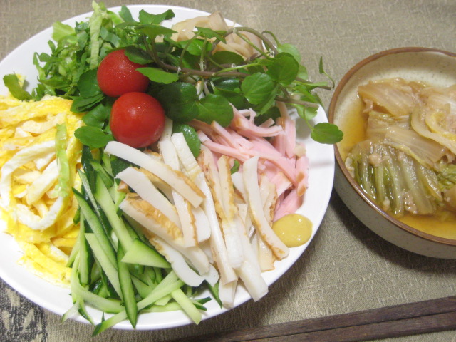 とにかく、暑くて何か冷たいものが食べたかったので、たまたま買ってあったのを思い出して冷麺にしてみました。具はキュウリ、錦糸卵、レタス、ちくわ、クレソン、ロースハム、プチトマト。ちょっと具だくさんになりすぎたのもあって、麺とセットになってたタレだけでは流石に足りなかったので、酢醤油にレモン汁などを加えて追い足しなどしてみたり(苦笑)