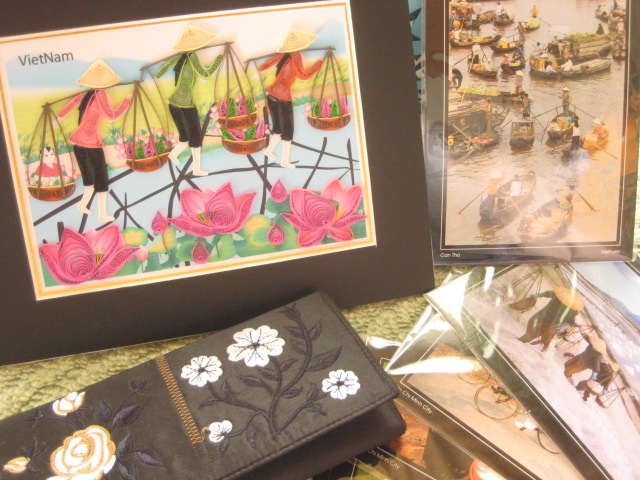ベトナムの街角でよく見かける土産物でポップアップのカードがあるんです。ベトナムの名所や(ホーチミンだとサイゴン大教会とか)天秤棒を担いだ女性、蓮の花といったものから、バースデーやクリスマスなどなどのモチーフで細かく作られていて、それが開いた状態で並んでいるのはなかなか心惹かれるんですが、いかんせん冷静に考えてみると、飾る場所にちょっと困る気が…。なので、偶然入った書店でも見つけたもののちょっと躊躇してたら、偶然目に留まったのがこのペーパークラフトの額。ポップアップのようなギミックさはないんですが、薄くて細い紙を巻いて、素朴な絵に立体感を持たせてます。