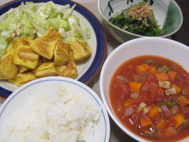 汁物はトマトの水煮が若干残っていたので、野菜スープにしました。野菜中心ですが、ここにマカロニなど入れるとボリュームも増して、主食にもなるスープになるかと思います。