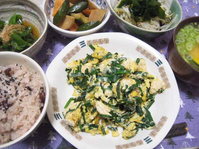 昨日の夕飯。主食を赤飯にしたので、メインは余り味の濃くないものを…ということで、久しぶりに材料も揃ってたので、ニラと鶏ひき肉の卵炒め。
