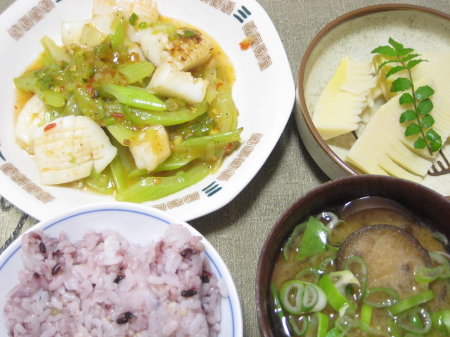 副菜は作り置きの筍の煮物、味噌汁は茄子の味噌汁で。
