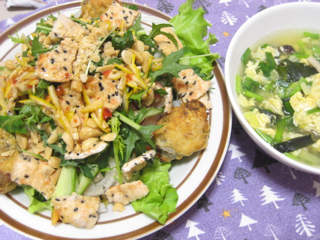 昨日のサラダのドレッシングだけでは味が薄くなるのと、同じ味っていうのも芸がないので、昨日のドレッシングにスイートチリとレモン汁、ニョクマムを加えて味を調整したら、バッチリはまりました。肉は豚肉を焼いてもよかったんですが、あっちでは代わりに揚げ春巻を載せたりもするので、じゃあこんなのはどうだろってことで、冷凍ストックしていた鶏ゴボウ団子を。野菜や春雨と一緒に一緒に食べたら想像以上に美味しくて、コレはハマる予感ですねー♪あ、他にトッピングとしてゴマとエビの入ったライスペーパーを砕いたものと、ピーナッツも使ってます。実に東南アジアっぽい?(笑)