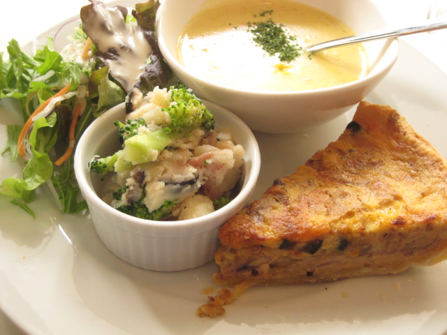 最初に頂いたのはキッシュセット。キッシュとスープ、サラダが二種類、ドリンクとしてコーヒー又は紅茶が確か選べたはず(私はコーヒーを選択)。飲物は食後のパイと一緒に持ってきてもらうことにしました。