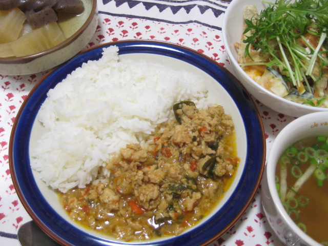 メインのガパオライスがタイ、副菜の大根とコンニャクの炊き合わせが和食、カボチャのサラダが洋食、でもってスープは中華の大根スープ…四つもか!(苦笑)