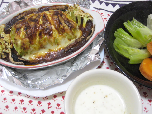 ロールキャベツは種の中に冷凍卵の黄身を包んでます。結構火を通した割に固まってなかったので、下煮にもう少し時間をかけてもよかったかなwともあれ、この種を包んだロールキャベツにデミグラスソースをかけ、トッピングにチーズを載せてオーブンで焼いて仕上げました。かなり御馳走感が高い見栄えになったかと…まぁ、もうちょっとソースも味が濃くてよかったかなとは思うところですがww