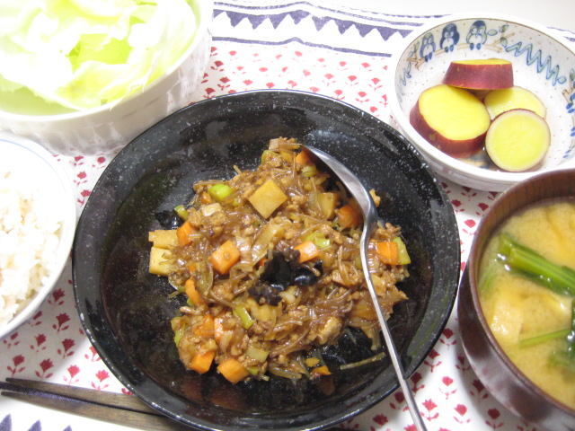 副菜はサツマイモのレモン煮。汁は小松菜と油揚げの味噌汁で。