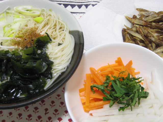この日はご飯を切らしていたのと、夏場に残った素麺を片付けたかったので、メインはにゅうめん。それに副菜としてゴボウの揚げ焼き(本当は別のものにしたかったんだけど、結果的にw)、大根とニンジンの和風サラダで。