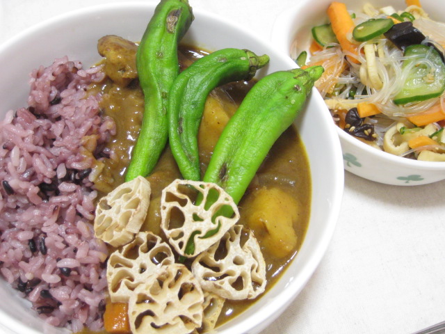 前の日に用事で実家に行った際にポークカレーをもらったので、この日はそれで。ただ、ちょっと野菜が少ないなと思ったので、焼き野菜をトッピングしてみました。で、折角なので、ご飯は黒米入りで。