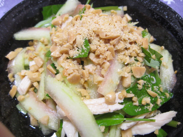スイカの皮の白い部分をメインにしたサラダです。スイカって、いつも白い部分が生ゴミとして結構かさばるので、ちょっと買い辛かったんですが、ベトナム料理ではこの白い部分をサラダとして利用すると聞いたので、試しに食べてみたら、冬瓜とかなり似た感じだったので(赤い部分との境目は調味液を絡めると甘味が引き立つ分、冬瓜より美味しいかも)、これは使えるとレシピを考えてみました。こうすると、捨てるのは表面の皮と種だけになるので、ゴミもぐっと減るし一石二鳥です。
