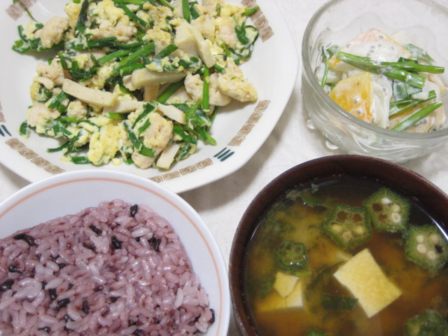 ニラの卵炒めは久しぶりな気がします。これと、サラダは大根と柿のヨーグルトサラダ。今年最初の柿です。味噌汁は豆腐とモロヘイヤにオクラで。
