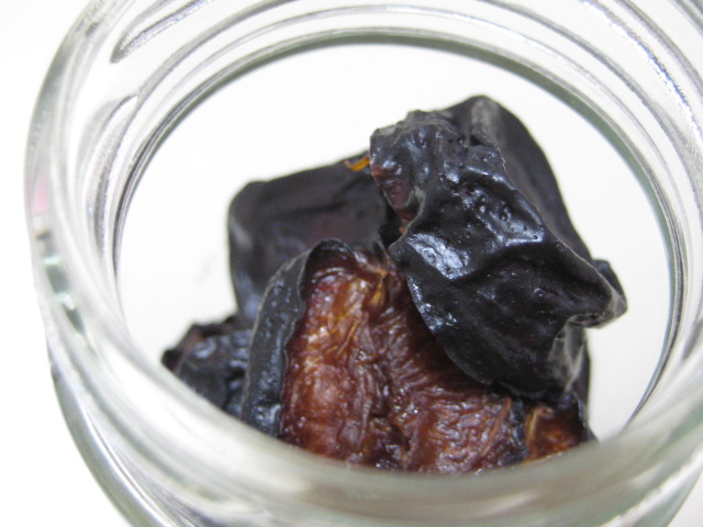 ←プルーン。これは割と満足のいく出来かな。砂糖は一切使わずに天日干し+オーブンの加熱で仕上げ(気温はともかく湿度が高すぎるので、天日干し100%だとカビや腐敗が怖いので、オーブンの加熱時間は必要でしょうね)。