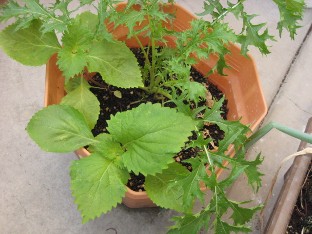 ←大葉と水菜。水菜は春からの分で発芽が遅かったこともあって、今まで残してあったんですが、そろそろ大葉の生育の邪魔になるし、間引く予定。