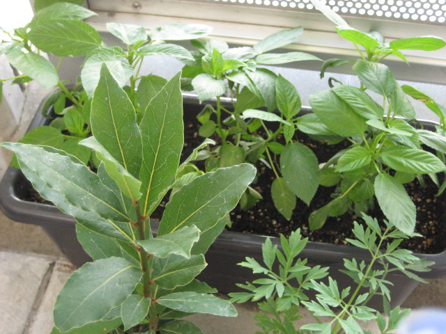 ←奥:モロヘイヤ、手前右:エルダー、手前左:月桂樹。モロヘイヤは苗が安かったのでプランターに植え替えてほぼ半月。いい具合に育ってきてます。エルダーと月桂樹は最近購入。どちらも初めて扱うので、上手く育てばいいんですけどねー。
